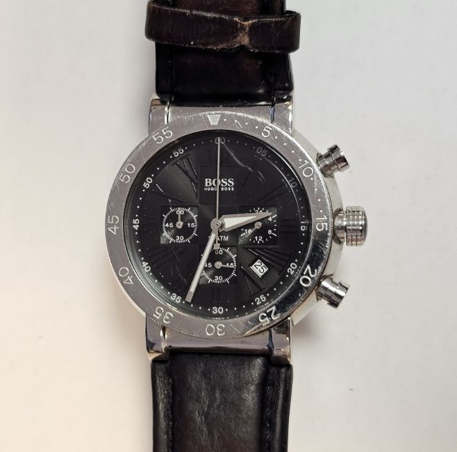 Gent's Hugo Boss stainless steel strap watch, the circular black dial with three subsidiary dials and date aperture, on brown leather strap, in original case