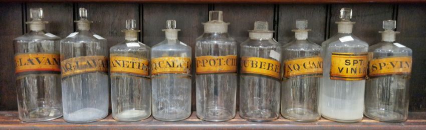 Nine various large late 19th/early 20th century labelled glass apothecary bottles and stoppers, each of cylindrical form, with assorted faceted rectangular stoppers, gilt and painted in black and red with labels, variously named for their contents comprising: AQ:CAMPH, AQ:LAVAND, AQ:ANETHEI, SP:VINI:R, P:CUBEBAE., AQ:CALCIS, SPT:VINI.R., TR:LAVAND.C, & P:POT:CH, some variations in size, approx. 25cm high overall max. (9) Provenance: from the collection of Darrin Baines, Professor of Health Economics.  Professor Baines filled his early Victorian townhouse in Leominster, Herefordshire, with Georgian and Victorian apothecary objects collected over a period of 20 years.  Darrin Baines, researcher and consultant, has produced health economics and health policy projects and contributed articles to numerous academic and trade journals. Some pieces in the collection were bought from a Victorian pharmacy in Upwell, The Fens, others from pharmacists across the country, from auctions in the UK and on the continent.
