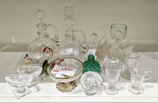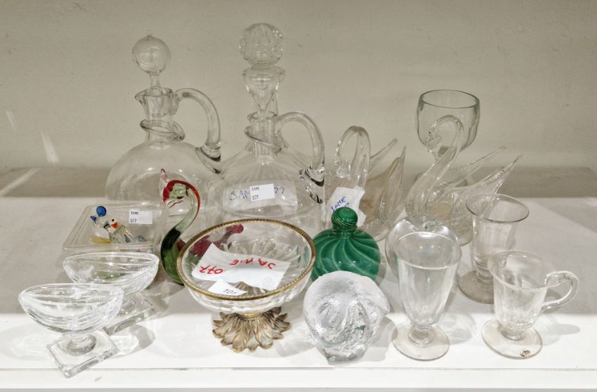 Assorted glassware including a pair of Waterford Regency-style boat-shaped salts on square bases, acid-etched marks, two carafes with matched stoppers, a cut glass ship's decanter and globe stopper, a pair of press moulded glass swan-shaped dishes, a glass custard cup, a Tiffany & Co apple-shaped paperweight, a Murano-style green cased spiralling perfume bottle and stopper, a Pukeberg (Sweden) elephant shaped paperweight, a Murano-style model of a swan and other items