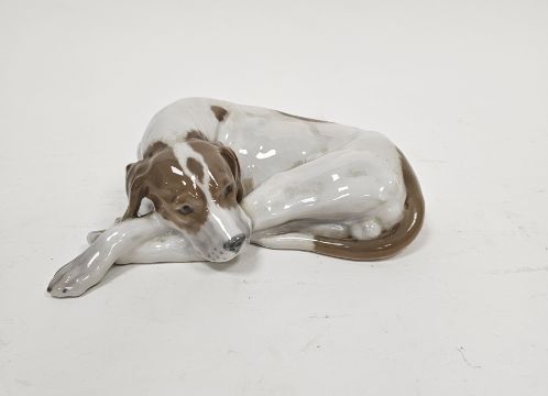 Royal Copenhagen porcelain model of a recumbent pointer, modelled by Lauritz Jensen, incised L.J. to base, printed green factory marks, blue wave and CF, shape no. 1634, 19.5cm wide