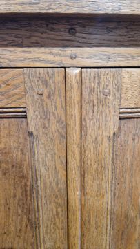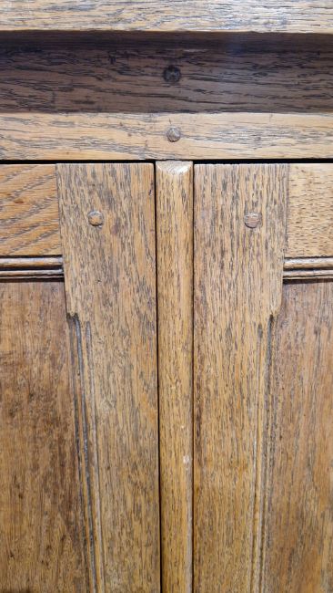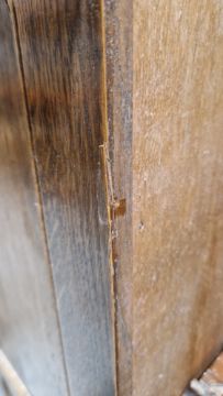 Surface scratches, scuffs and knocks. Some fading/discolouration, mainly to the front. Split to top, small section missing/cut away from back corner of top and gallery section. Split to lower half of right sight. Doors open smoothly and it is structurally solid. General wear and tear.