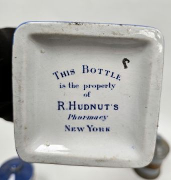 19th century English pottery blue ground apothecary jar and cover, of cylindrical form, applied with a paper label named for UNG.HYDR.NIT.DIL., another of pale blue ground bearing paper label named for UNG.ACID.CARBOL. and a Richard Hudnut's Pharmacy (New York) pottery blue ground bottle named for Perfume White Rose, of square section, printed blue marks to base, 24cm high (3)  Condition Report UNG.HYDR.NIT.DIL.,- this has a matched cover, rim chipping to cover, some stained glaze crazing to the interior of the jar. Some typical wear overall.UNG.ACID.CARCOL. - very large area of rim chipping to rim, issuing two hairline cracks to rim, wear and crazing overall.Hudnut jar - some minor wear and crazing, no stopper.
