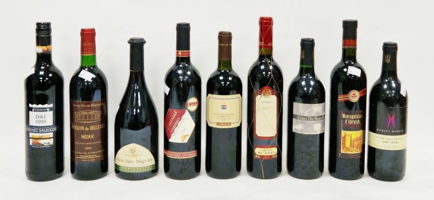 Nine bottled of assorted red wine to include Grand Vin de Bordeaux Pavillo de Bellevue Medoc 1989, Baturrica Tarragona 2000 Grand Reserve and Louis Bennard Cotes du Rhone Villages 1999