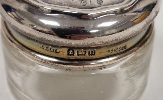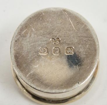 Four silver circular easel back photograph frames including two matching Sheffield 1983 and 1992, Carrs of Sheffield Limited, 9.5cm diameter, another small silver framed circular photograph framed, three silver tooth boxes/pill boxes, one hallmarked, of circular form, the other two square and heart-shaped, stamped 925, three small glass dressing jars with silver lids and other items