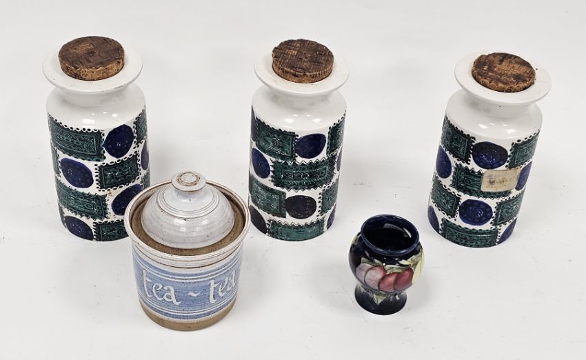Set of three Portmeirion pottery Talisman pattern cylindrical storage jars and cork stoppers, printed marks, designed by Susan Williams-Ellis, pattern no. 9454, 20cm high, a small Moorcroft baluster blue-ground Wisteria pattern vase, impressed Moorcroft/Made in England marks 8.4cm high (small rim chip) and a studio pottery cylindrical 'tea' canister and domed cover, impressed dot and cross seal mark (5)