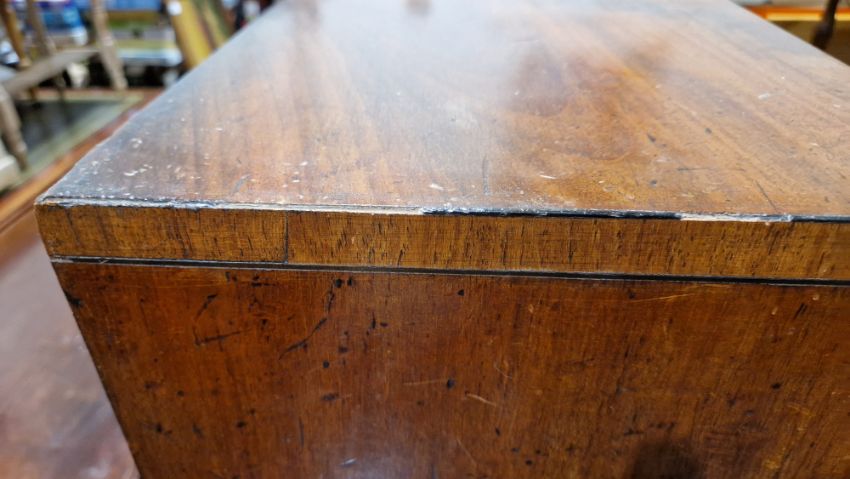 Surface scratches, scuffs and knocks. Fading/discolouration, accretions. Areas of loss to the ebonised beading around top. Areas of loss to veneer on front left foot and back right foot. General wear and tear.