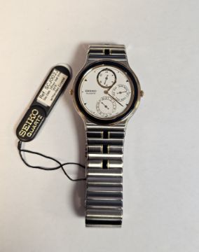 Seiko stainless steel day/date 24 hour dual time wristwatch, having dot numerals, three subsidiary dials, all with blue and white highlights