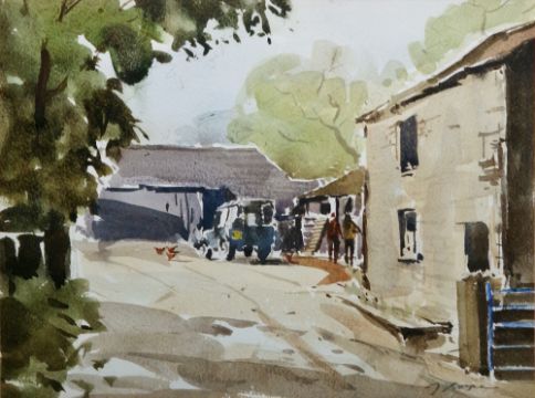 John Boyce (b.1938)  Watercolour drawing  Farmyard with figures, signed lower right, 23cm x 31cm, framed and glazed  Jenny Keal Watercolour drawing Coastal landscape, signed, 7cm x 16cm, framed and glazed Two various watercolour drawings and a humorous pen and ink sketch, mid-20th century (5)
