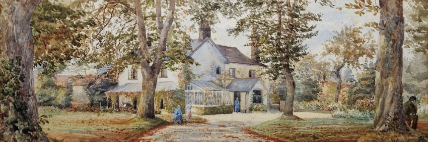 C. R. (20th century) Watercolour Lakeside landscape, monogrammed CR lower left, framed and glazed, mount aperture 17cm x 50cm, another watercolour by the same hand depicting a house and garden with figures, monogrammed lower right, framed and glazed, mount aperture 16.5cm x 49.5cm and two further unsigned watercolour landscapes (4)