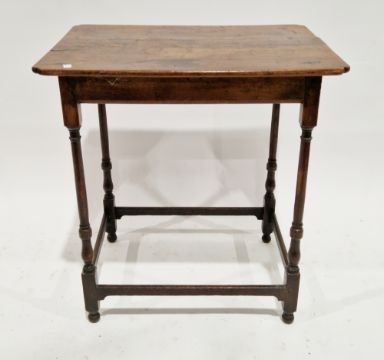 18th century oak side table, the rectangular top on a base with slender turned and block legs united by square stretchers, 69cm high x 65cm wide x 49cm deep