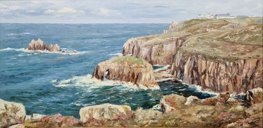 Nancy Bailey (1913-2012) Oil on canvas "Enys Dodman, Land's End", coastal landscape, signed lower right, signed and titled verso, 46cm x 91.5cm