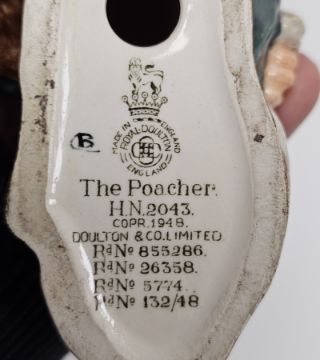 Royal Doulton figure of The Poacher, printed green marks, H.N.2043,  a Royal Worcester model of a seated fox hound 17cm high, printed puce marks, a Copeland Spode model of a mallard before reeds in flight and a model of tern, on a grassy rocky base, printed green marks (4) Condition Report Tern - Area of loss to one tail feather. Crack to another tail feather. General wear and tear.