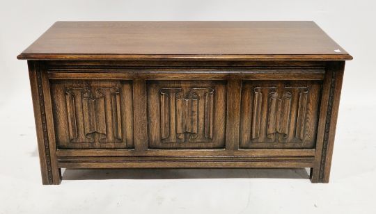 Oak coffer in the 17th century manner, the hinged top with thumbmould edge, three front panels with linenfold carving, on stile feet, 49cm high x 105cm long x 44cm deep