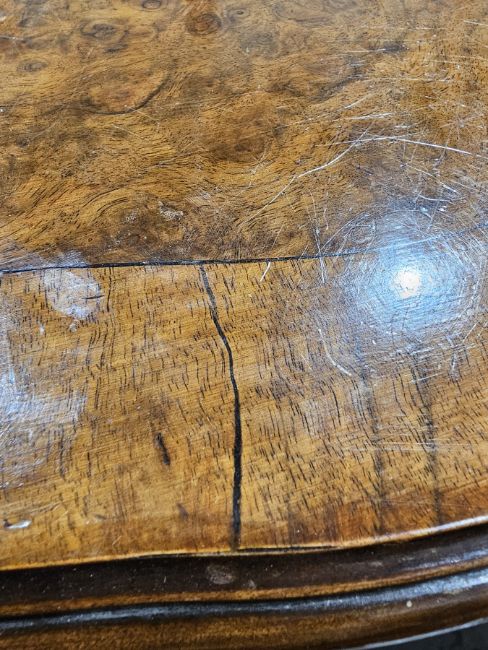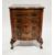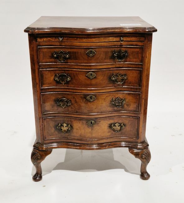 Walnut chest of serpentine outline in the George III manner, the crossbanded top with ogee moulded edge, over a brush slide and four long graduated cockbeaded drawers with drop loop handles and shaped backplates, canted sides, on four short cabriole legs, 68cm high x 51cm wide x 40cm deep  Condition Report Some wear in spots to the front and sides. Scratches underneath the varnish. The bottom of one of the drawers is slighly out.There apears to have been a repair to th back left foot.No major splist or cracks.The drawers all run smoothly.No obvious sign of wood worm.The polish seems fine.Please see attached images.