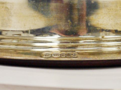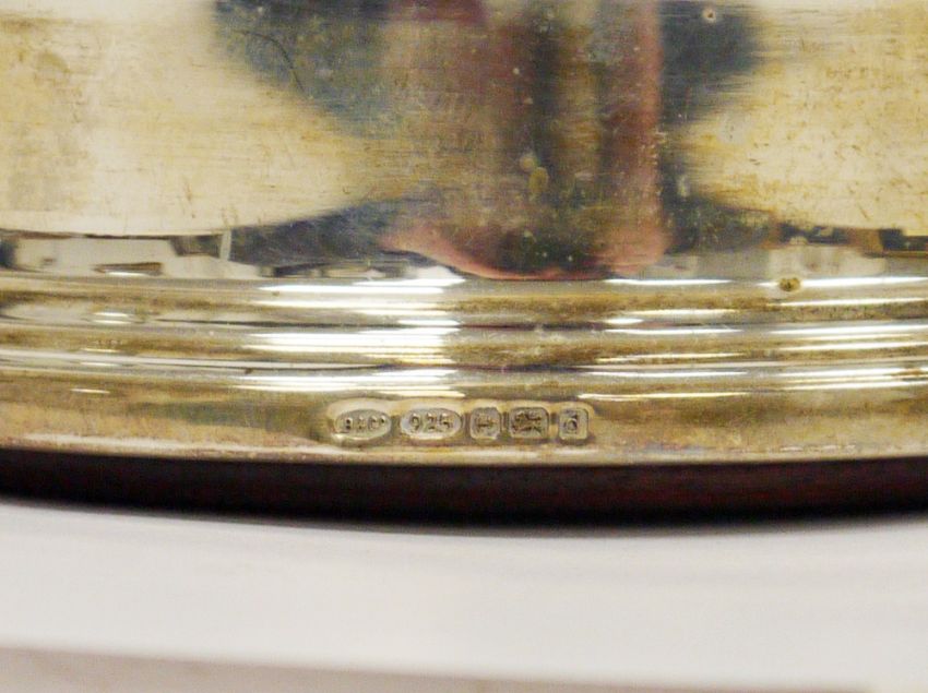Silver and turned oak wine coaster, Birmingham 2003, W I Broadway & Co, of circular form with stepped base, 13cm diameter and a silver and turned mahogany wine coaster, London 1993, HC Hersey & Son Ltd, of plain form on a reeded base, 13cm diameter (2)