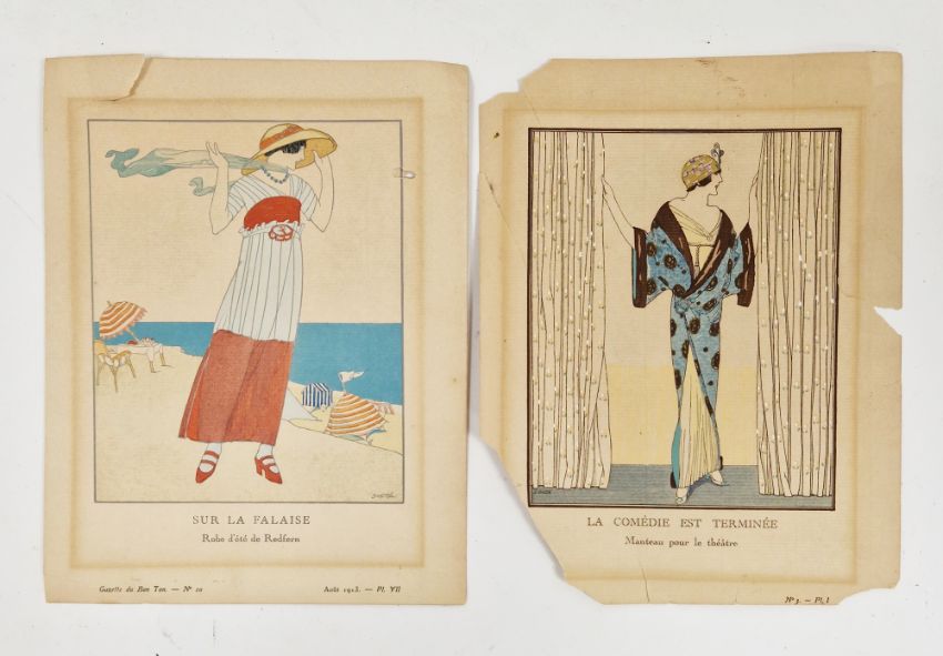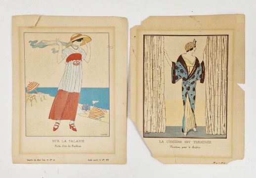 Andre Edouard Marty (1882-1974)  Handcoloured stencil  Fashion plate 'C'est Moi, Manteau de Paul Poiret', 20cm x 15cm framed and glazed  David  Two fashion plates  'La Zibelane' and another and two other fashion plates, early 20th century (one unframed) (5)