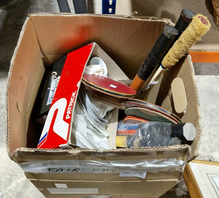 Box of vintage tennis rackets, a part tea set etc.