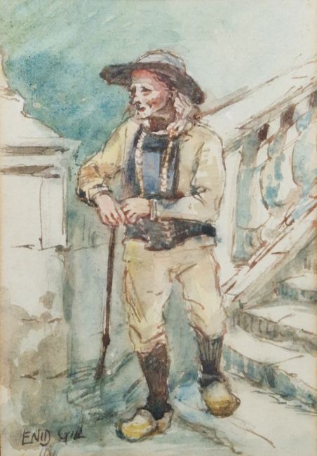 Portrait of Catherine Louisa Blackith (died 1832) seated at harpsichord holding sheet music, oval, framed and glazed, mount aperture 19cm x 15cm, together with a watercolour of an old man before steps by Enid Gill, signed and dated 1911 and a watercolour portrait of a young woman wearing blue headscarf (3)