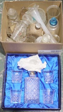 Mixed lot of glassware and metalware including Art Deco, boxed lead crystal tumbler set, decanters, silverplate, brass and other items (3 boxes)