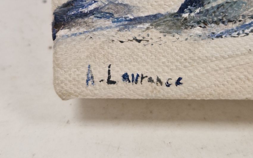 Angela Lawrence (contemporary) Oil on canvas "Boats at rest, Mossyard", signed lower left, unframed, 20cm x 20cm  Gouache study Otters beside river's edge, 9cm x 8cm (2)