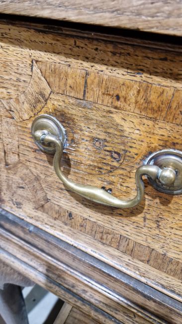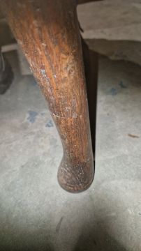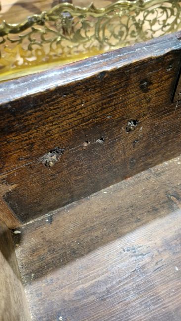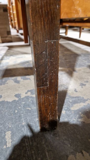 Surface scratches, scuffs and knocks, some fading/discolouration and stains. Repairs to both front legs. Repairs and areas of old worm to both back legs. Handles have been replaced. General wear and tear.
