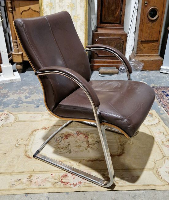 Hands of Wycombe - set of five contemporary boardroom elbow chairs having brown leather upholstered seats, backs and curved elbow rests, compressed wooden backs and chrome-effect cantilever frames, 87cm high x 56cm wide x 71cm deep (Please note VAT will be payable on the hammer for this lot)