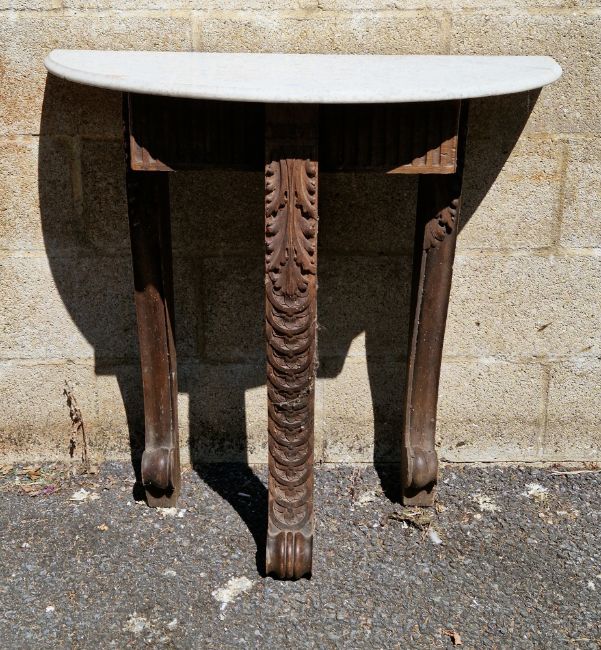 19th century demi-lune side table, comprising a matched marble top on an oak base with three carved foliate capped scrolling legs with lion paw feet, 86cm high x 91cm wide x 45.5cm deep