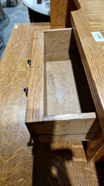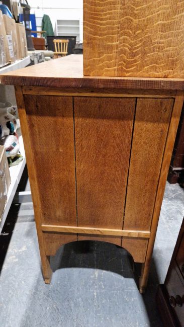 Early 20th century Arts & Crafts oak dressing table, the upper section with a rectangular swing mirror flanked either side by leaded stained glass panels in the Art Nouveau manner, over a shelf with small drawer, the base with two drawers over a long drawer with metal drop loop handles and shaped backplates, on stylised legs, 173cm high x 107cm wide x 45cm deep