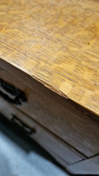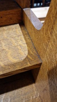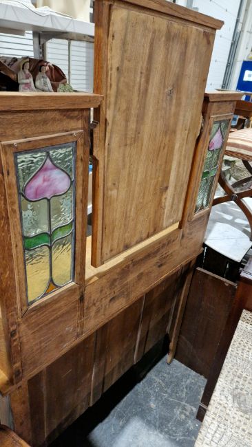 Some surface scratches, scuffs and knocks. Split to left side of top section. Cracks to to stained glass panels. Mirror plate is distressed in both top corners. General wear and tear.