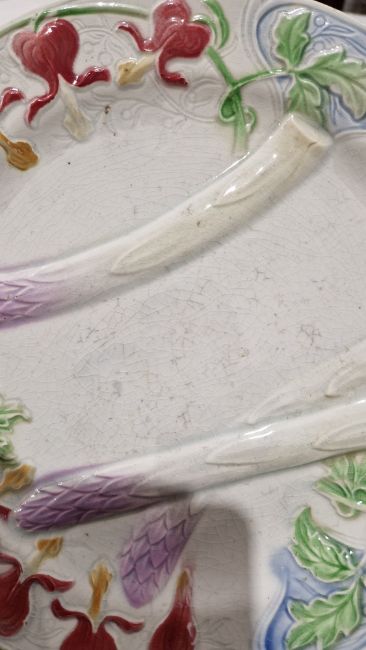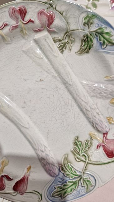 Surface marks and accretions. Varying degrees of crazing to all. Discolouration/browning to some plates. Chip to edge of one fruit plate, hairline crack to two fruit plates. General wear and tear.