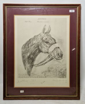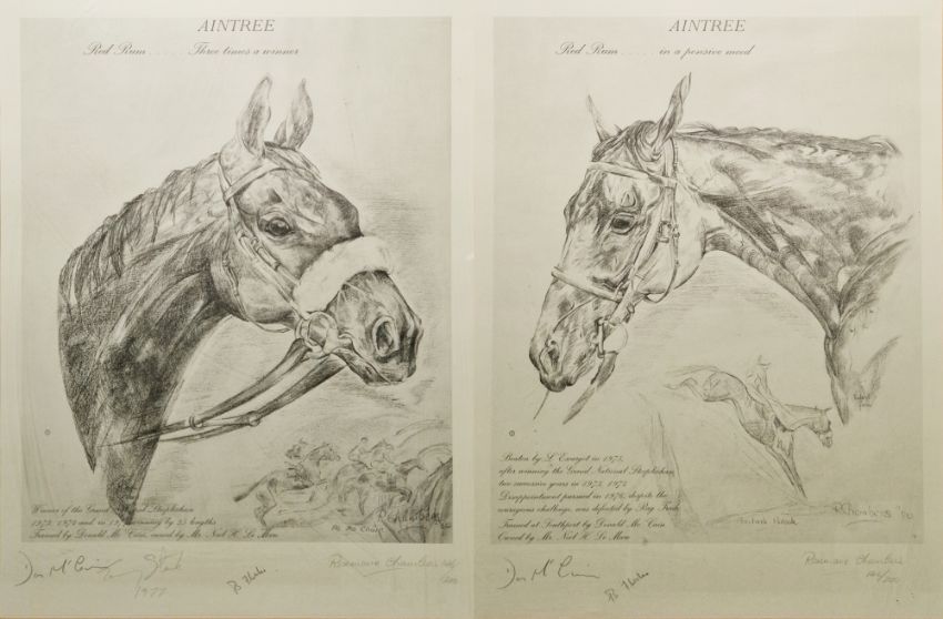 Rosemarie Chambers Collotype "Red Rum...Three Times Winner", limited edition print 146/200, signed by artist lower right, also signed by trainer Donald McCain, jockey Tommy Stack and Brian Fletcher, framed and glazed, mount aperture 51cm x 38.5cm, together with another, similar, entitled "Red Rum...In a Pensive Mood", numbered 146/200, signed by artist, Donald McCain and Brian Fletcher (2)