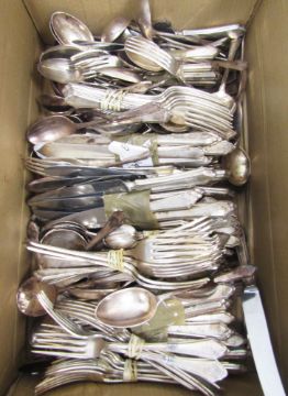 Large matched collection of silver plate flatware, Pembury pattern handles, some engraved with a crest of a crown over a cross, mainly forks, knives, dessert spoons, tea spoons, soup spoons and sauce ladles