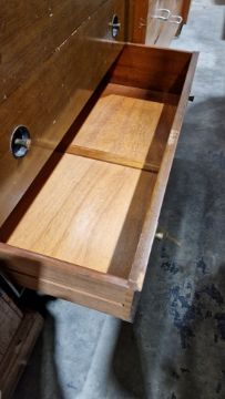 Numerous surface scratches, scuffs and knocks. Area of loss to varnish on top drawers. General wear and tear.