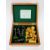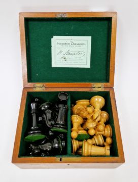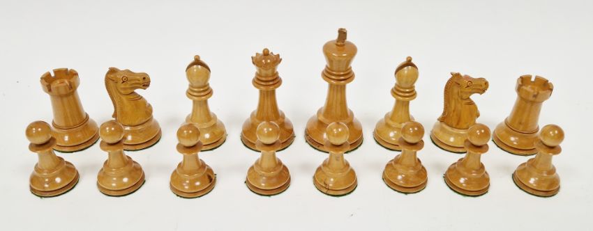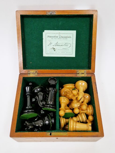 Staunton Chessmen chess set with ebonised and boxwood weighted chess pieces, king 8cm high, retailed by Jaques & Son of London, in mahogany box with green baize lining, with green label to the underside of the lid (slight damage)