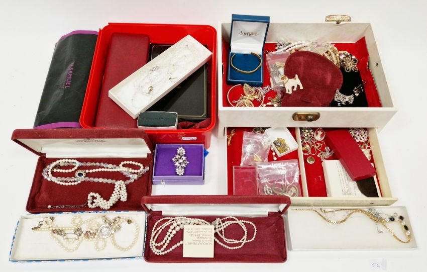Mixed lot of costume jewellery including necklaces, pendants, brooches, RAF sweetheart style brooch, bracelets and other items together with a collection of empty jewellery boxes