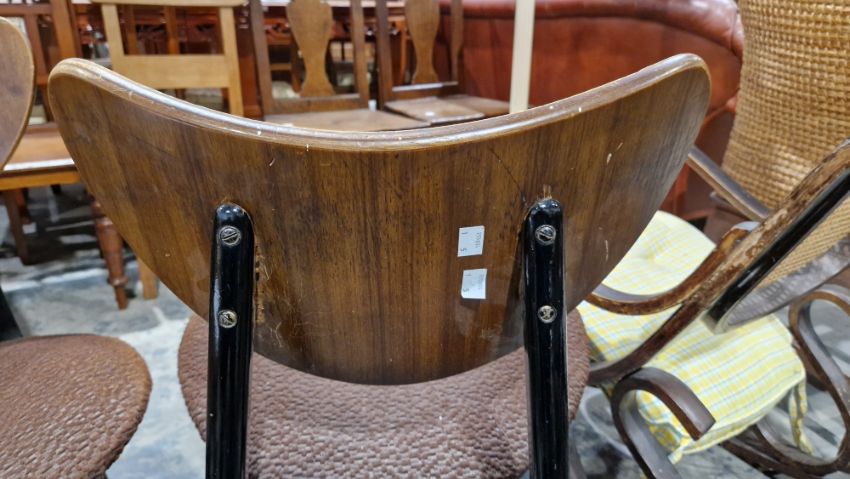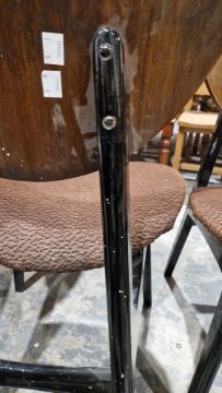 Surface scratches, scuffs and knocks. Fading/discolouration to backrests. Flecks of white paint to both frames. One chair has glue around area backrest is screwed into back posts, pss old repair. General wear and tear.