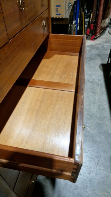 Chest with surface scratches, scuffs and knocks. Areas of fading/discolouration and stains, mainly to top. Drawers open smoothly. General wear and tear.