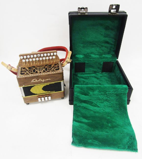 Castagnari ' Lilly ' melodeon, walnut case, having a bank of 21 mother of pearl effect right hand buttons and 8 mother of pearl effect left hand buttons, fretwork carved sound panel, leather shoulder strap, 25cm high x 21.5cm wide, contained a black leather covered case, lockable with two keys
