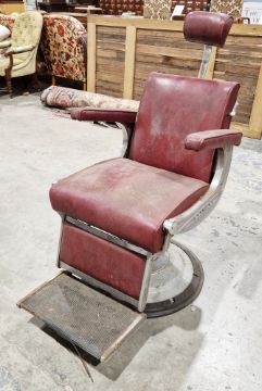 Mid-century Belmont barber's chair upholstered in red leatherette, with adjustable head rest, foot rest with rubber mat, on a chrome frame with circular base, 116cm high x 58cm wide x 89cm deep