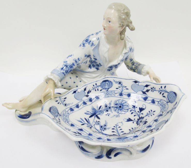 Late 19th century Meissen blue onion pattern figural sweetmeat dish, blue cross swords marks, impressed numeral 46, incised 2863, modelled as a gallant recumbent supporting a scrolling dish, enriched in blue with onion pattern on scroll moulded base (areas of restoration), 30cm long