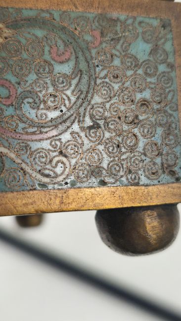 Light surface scratches, accretions. Lid slightly askew. Tiny areas of loss to the enamel. Back left foot slightly pushed in resulting in loss to interior enamel around that area. General wear and tear.