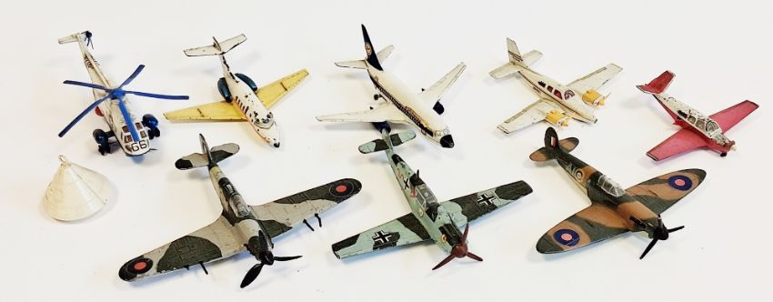 Eight playworn Dinky Toys airplanes and helicopters to include Hawker Hurricane MK II c, Messerschmitt Bf 109E, Spitfire MK II, Beechcraft S 35 Bonanza, Sea King, 717 Boeing 737, Beechcraft C55 Baron and 723 Hawker Siddeley 125 (8)