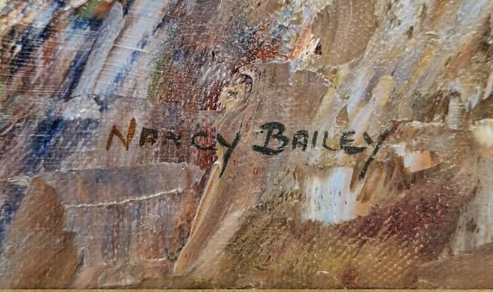 Nancy Bailey (1913-2012) Oil on canvas "The Droskyn, Perranporth", coastal landscape with cliffs, signed lower right, signed and titled verso, 45.5cm x 91.5cm