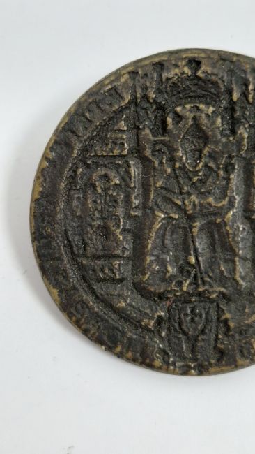 Bronze seal matrix, circular, with loop to reverse, of Ecclesiastical design depicting seated bishop, 5cm diameter with plaster seal (damaged), mounted on perspex stand  Condition Report Photo of reverse added.Seal is not fixed to perspex.No provenance available.