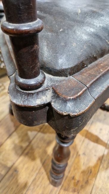 Victorian mahogany tub corner chair having an upholstered scrolling crest, scrolling arms with carved patera, ornate carved splats (two damaged), upholstered stuffover seat, on five turned baluster legs united by a cross-stretcher, 82cm high x 78cm wide x 52cm deep  Condition Report Surface scratches, scuffs and knocks. Losses, splits and chips to moulding around seat. Half of one back splat is missing, area of loss to two others. Numerous areas of old worm on edge and underside of frame around seat. Slightly loose joints. Leather with splits/cracks and wear. General wear and tear.H. 84cm, W. 78cm, D. 53cm