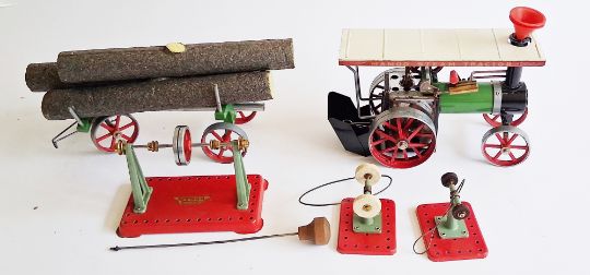 Mamod TE1A live steam tractor together with trailer carrying logs, Mamod line shaft, Mamod polisher and Mamod roller