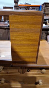Pair of mid-century teak bedside units, wall or headboard mounted, each with a back panel holding a table with a shelf below, on a single set of legs, 85cm high x 56cm wide x 39cm deep  Condition Report Good overall condition. Some light surface marks, scuffs. General wear and tear.Height from floor level to base of unit - 36cmHeight of unit section (minus backboard) - 19cmHeight of unit section including backboard - 45.5cm