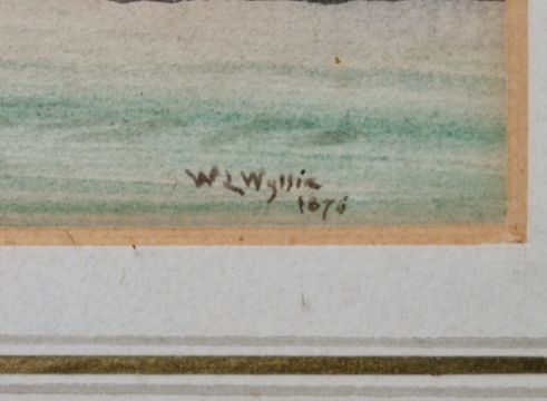 William Lionel Wyllie (British, 1851-1931) Watercolour drawing  Coastal scene at sunset, signed lower right and dated 1876, 9cm x 22cm  Condition Report Good overall condition. No obvious signs of restoration, foxing or browning. Possibly some fading/discolouration. General wear and tear.