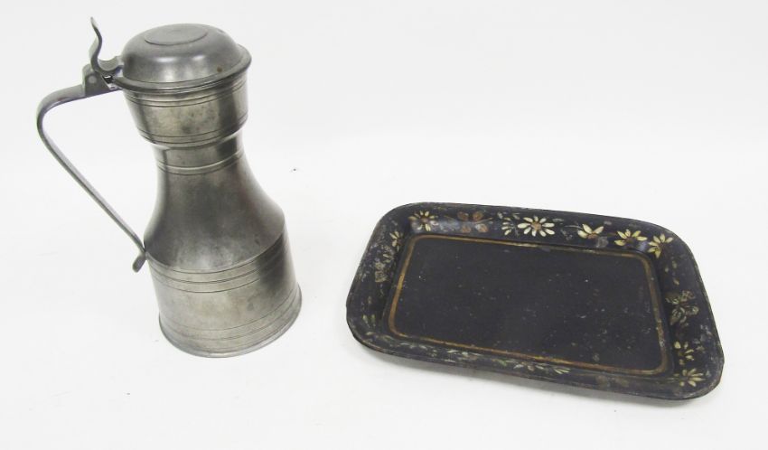 18th century /  early19th century pewter tappit hen, the domed hinged lid with thumbpiece, the body of typical form with ringed decoration, touchmarks to base, 27cm high together with black toleware tray of rectangular form with floral painted rim, 30cm long (2)