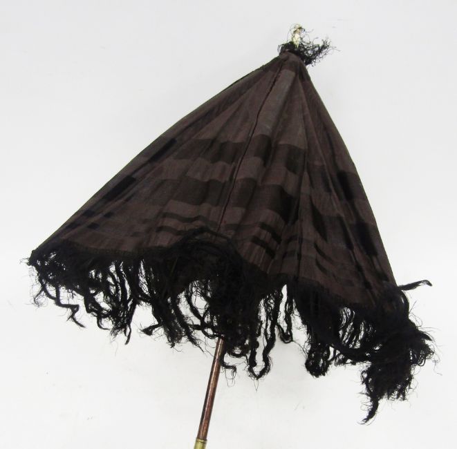 1920's dark fabric parasol with black fringe, small size possibly for a child or doll, having a turned wooden handle with brass grip, 47cm long